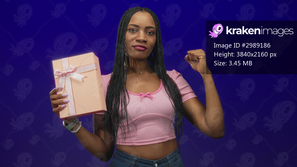 Black woman holding pink gift box with raised fist gesture in studio wearing pink crop top and jeans; confidence empowerment.