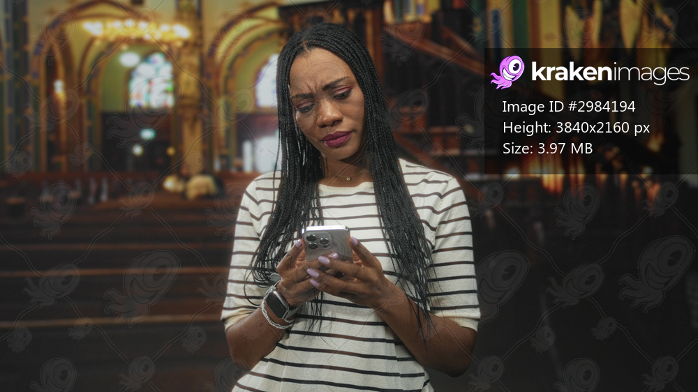 Black woman holding smartphone with both hands, reading message with furrowed brow and pursed lips, striped top inside ornate church building; sorrow reflection. - Kraken Images