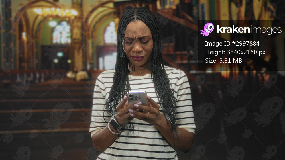 Black woman holding smartphone with both hands, reading message with furrowed brow and pursed lips, striped top inside ornate church building; sorrow reflection. - Kraken Images