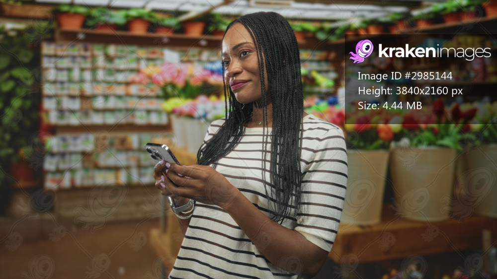 Black woman holding smartphone and bouquet of flowers in a shop building, hands texting with a slight smile; contentment focus.