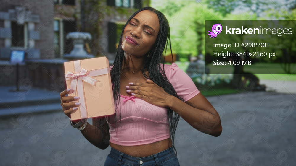 Black woman holds a pink gift box with ribbon, hand pressed to chest gesture, wearing pink shirt and jeans, standing in front of a building; gratitude celebration. - Kraken Images