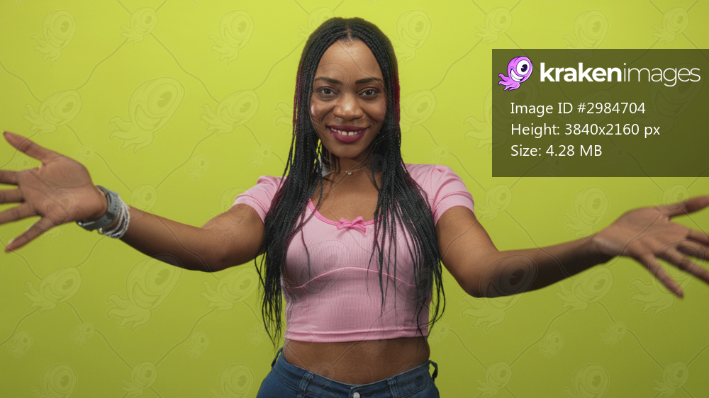 Black woman hugging her arms with crossed arms, shoulders exposed, wearing a pink crop top and smartwatch against a green studio backdrop, smiling gently; self care joy. - Kraken Images