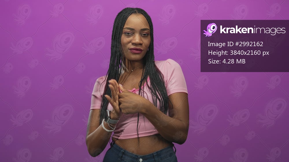 Black woman in a pink crop top clapping hands and showing thumbs up while smiling in a purple studio with braided hair and bracelets; approval.