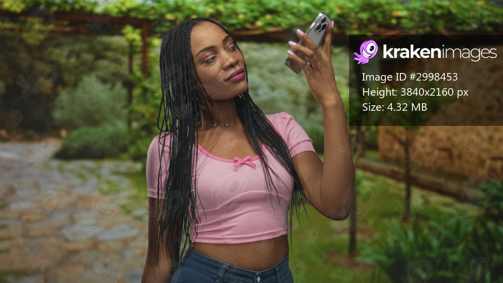 Black woman in pink crop top holds smartphone to her ear while smiling in a building courtyard with stone path and trellis; confidence.