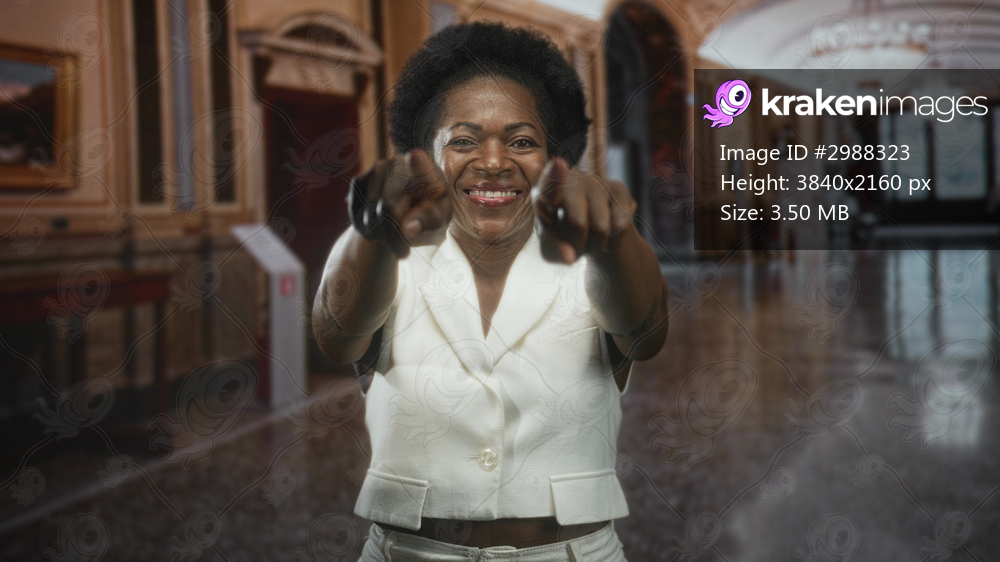 Black woman in white sleeveless blazer smiles at camera inside a museum building; confidence dignity.