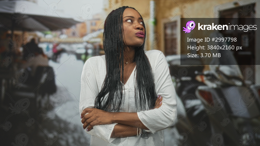 Black woman with long braids and arms crossed wearing white blouse beside parked scooter on street, urban cafe scene; confidence poise.