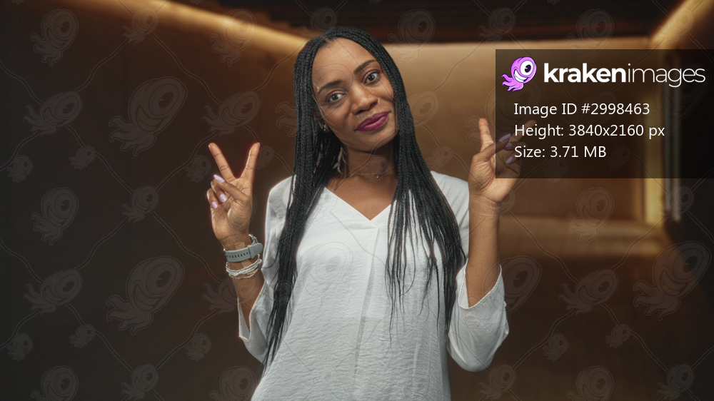 Black woman makes victory sign with right hand, long braids and white blouse, standing in a dim building corridor; joy peace.