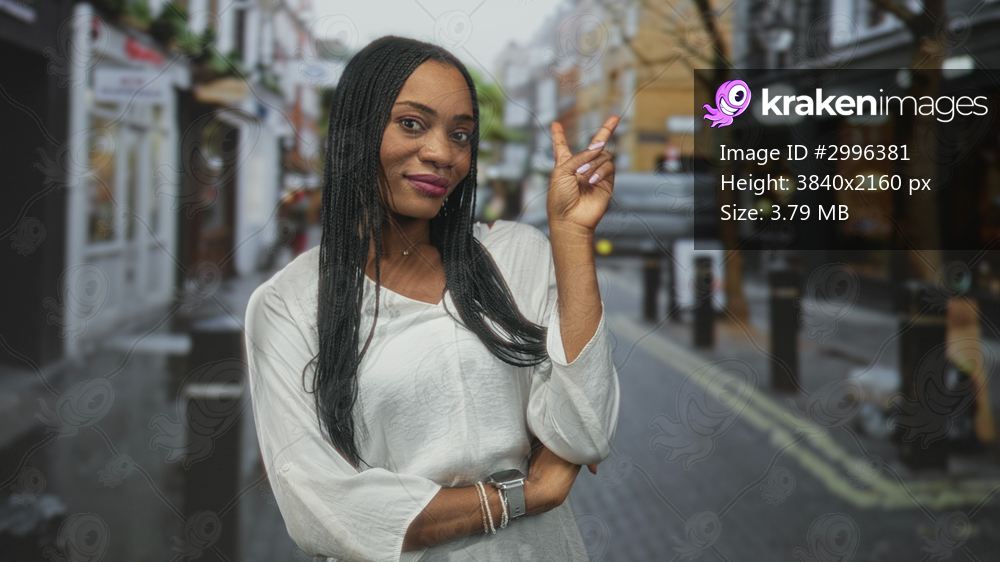 Black woman making peace sign with right hand, wristwatch and bracelets visible on street; urban confidence.