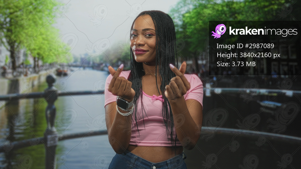 Black woman on a canal bridge making finger heart gestures with hands and visible midriff in a pink crop top; playful affection.