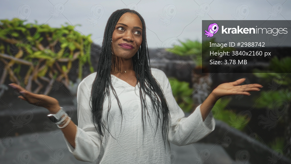 Black woman with outstretched hands shrugging in a building courtyard, white blouse and bracelets visible; curiosity openness.
