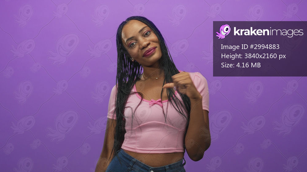 Black woman pointing finger to chest wearing pink crop top and denim jeans in purple studio; confidence self identity.