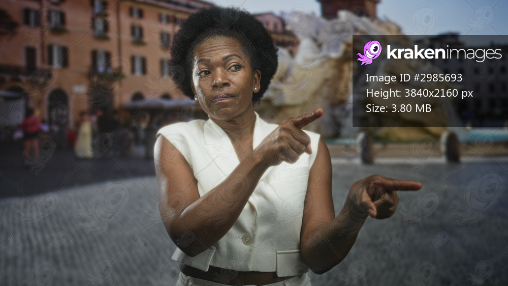 Black woman pointing fingers with both hands to different directions on street beside fountain and stone plaza; doubt hesitation.