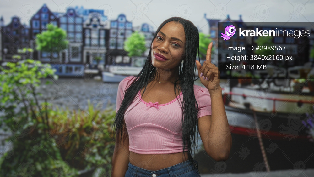Black woman pointing index finger up toward camera in studio with canal boat mural backdrop, wearing a pink crop top and jeans; confidence reminder.