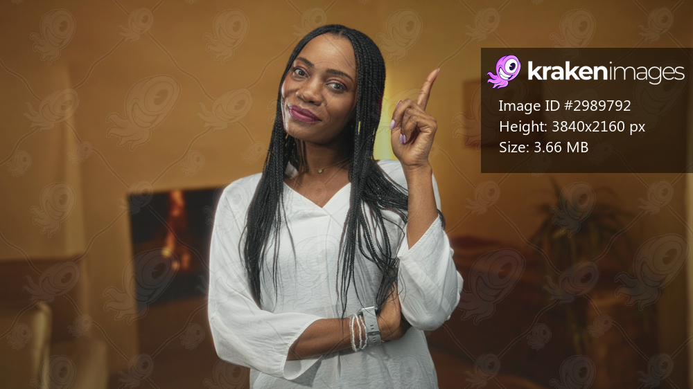 Black woman pointing index finger, wearing white blouse and bracelets, standing in a building living room with fireplace and plant; confidence reflection. - Kraken Images