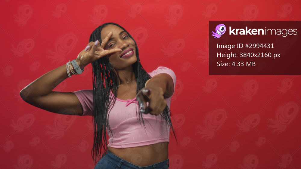 Black woman points finger at camera and makes peace sign near eye in studio wearing pink crop top and jeans; playful confidence.