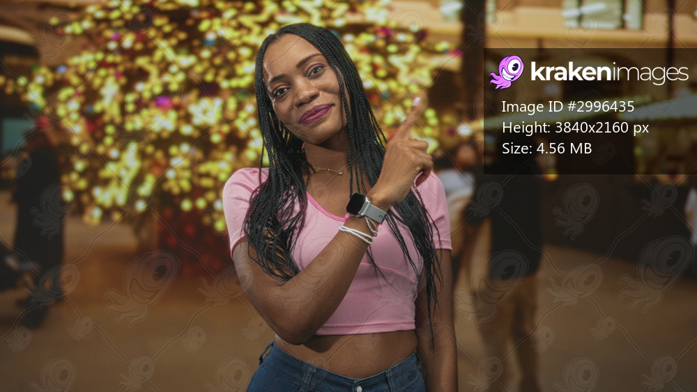 Black woman points finger at illuminated christmas tree, bare midriff visible in busy indoor building; holiday joy.