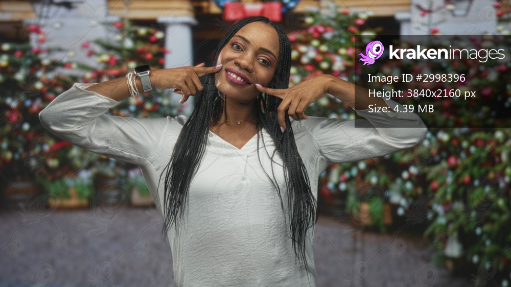 Black woman points finger to cheeks near decorated christmas trees and storefront on a street, wearing white blouse and bracelets; holiday joy.
