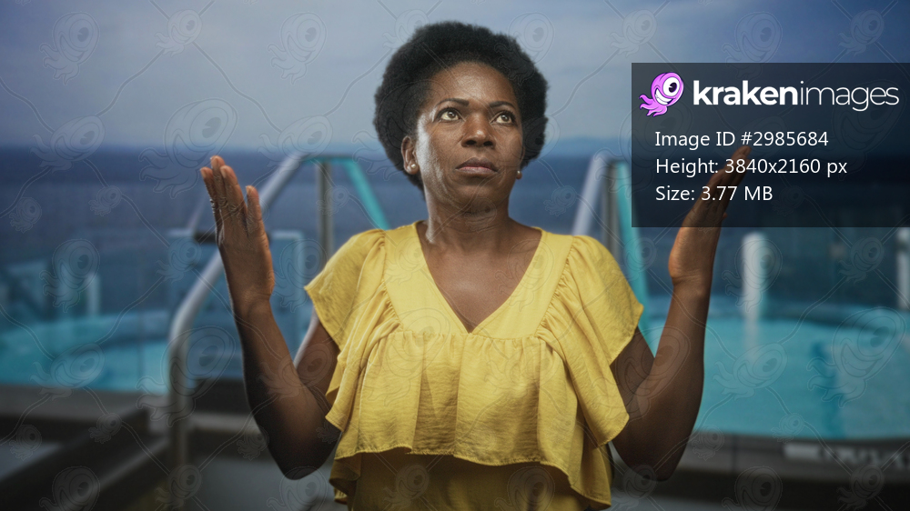 Black woman pressing temples with closed eyes by pool on building deck, hands visible and wincing; stress relief.