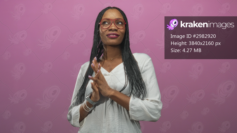 Black woman with red glasses presses hands together showing manicured nails and smartwatch in studio; quiet confidence.