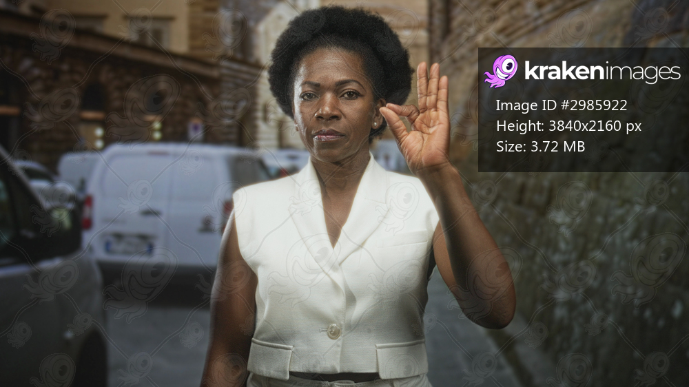 Black woman showing ok sign with raised right hand on narrow cobbled street wearing white sleeveless vest and serious expression; quiet determination.