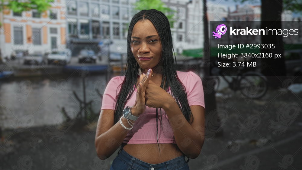 Black woman showing thumbs up and clapping hands, exposed midriff visible, on a street by canal buildings and parked bikes; confidence youth empowerment. - Kraken Images