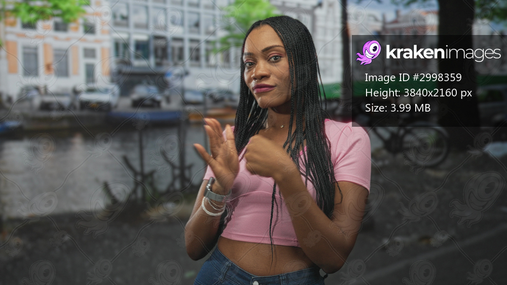Black woman showing thumbs up and clapping hands, exposed midriff visible, on a street by canal buildings and parked bikes; confidence youth empowerment. - Kraken Images