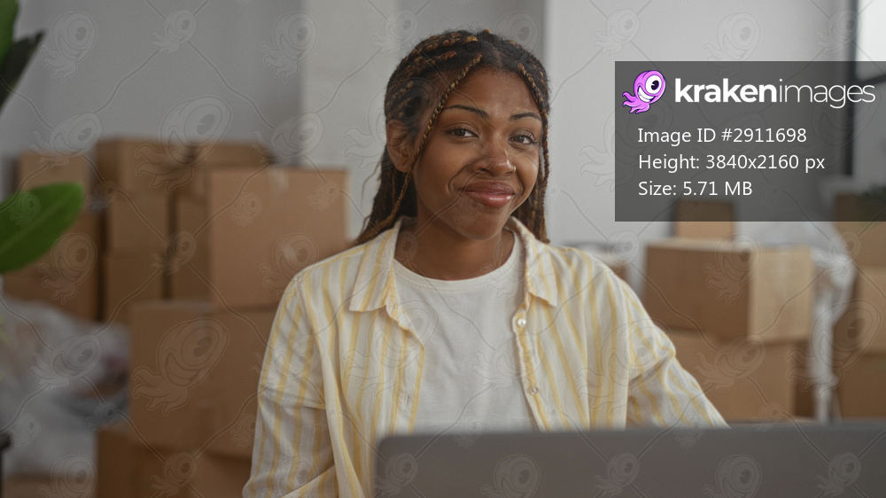 Black woman smiles at a laptop among stacked moving boxes in a new home inside a building while organizing boxes and paperwork; hopeful fresh start.