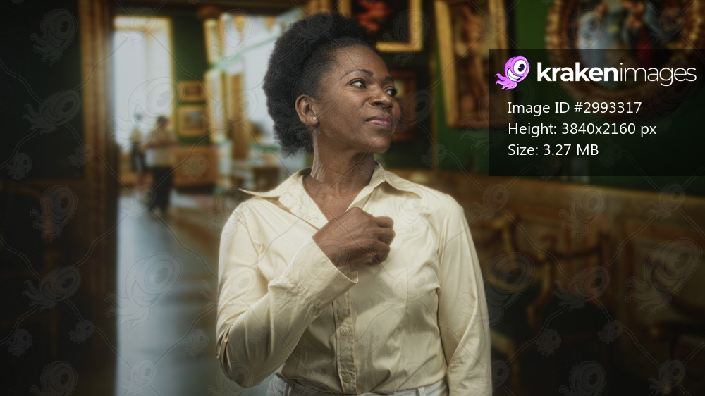 Black woman smiles with hand to chest and head tilt, cream blouse viewing an ornate gilded painting on a green wall in a museum corridor; serenity.