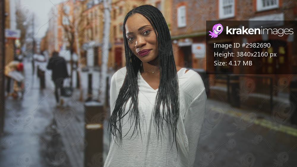 Black woman smiles with long braids and white blouse, pendant and watch visible while posing on a wet city street; confidence candid urban.