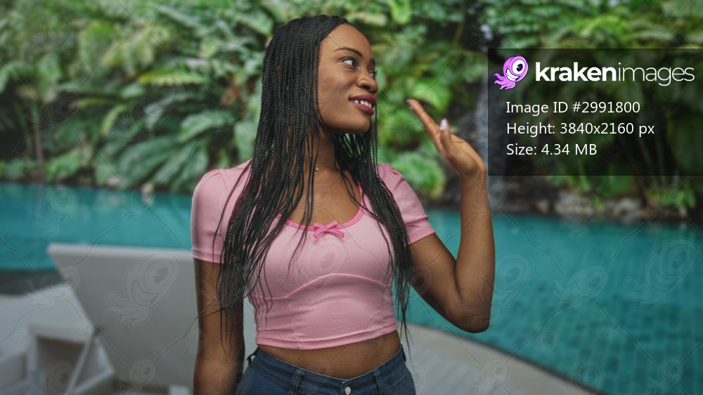 Black woman waves hand, bare midriff visible, standing by a hotel building pool with waterfall and tropical plants; vacation joy.
