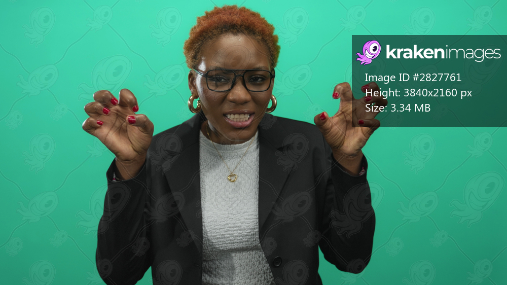 Black woman wearing glasses and blazer makes roaring claw hands gesture against a vibrant green studio wall; playfulness.