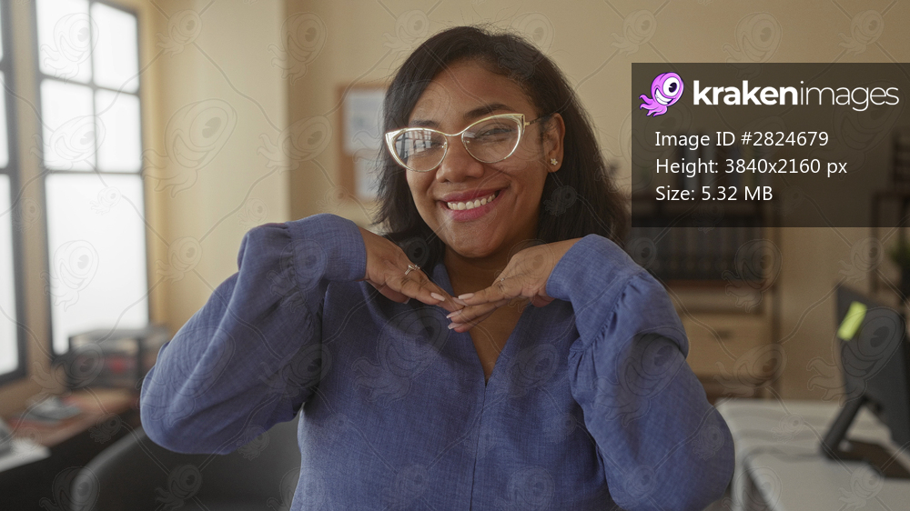 Black woman wearing glasses smiles while holding her hands under her chin at an office desk; happiness.