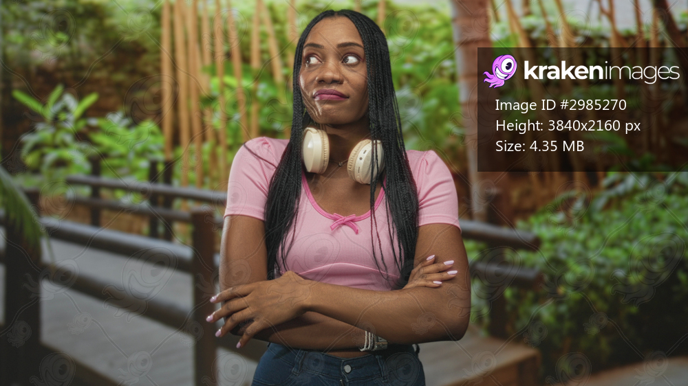 Black woman wearing headphones around neck crossing arms on a wooden walkway amid bamboo and green plants in a forest; quiet confidence.