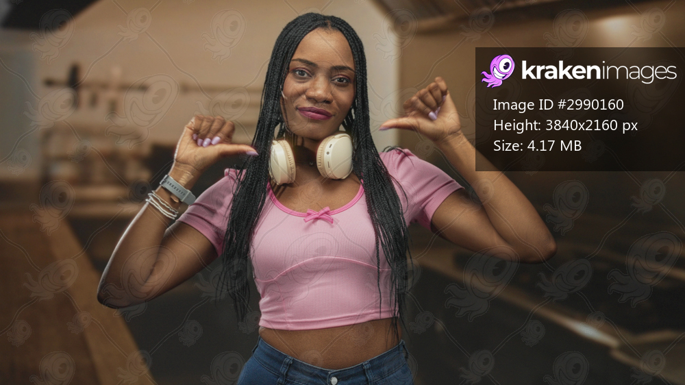 Black woman wearing headphones around neck points thumbs to chest in studio, pink crop top and jeans with braided hair; confidence attitude.