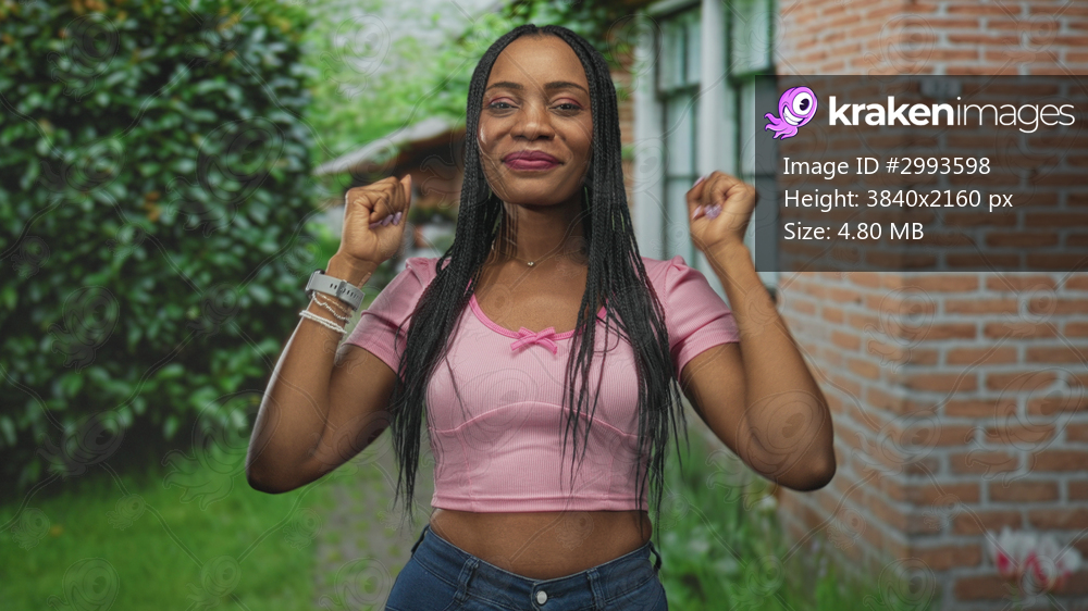 Black woman wearing pink crop top and jeans dancing with raised fists and visible midriff in front of a brick building and garden window; joy confidence. - Kraken Images