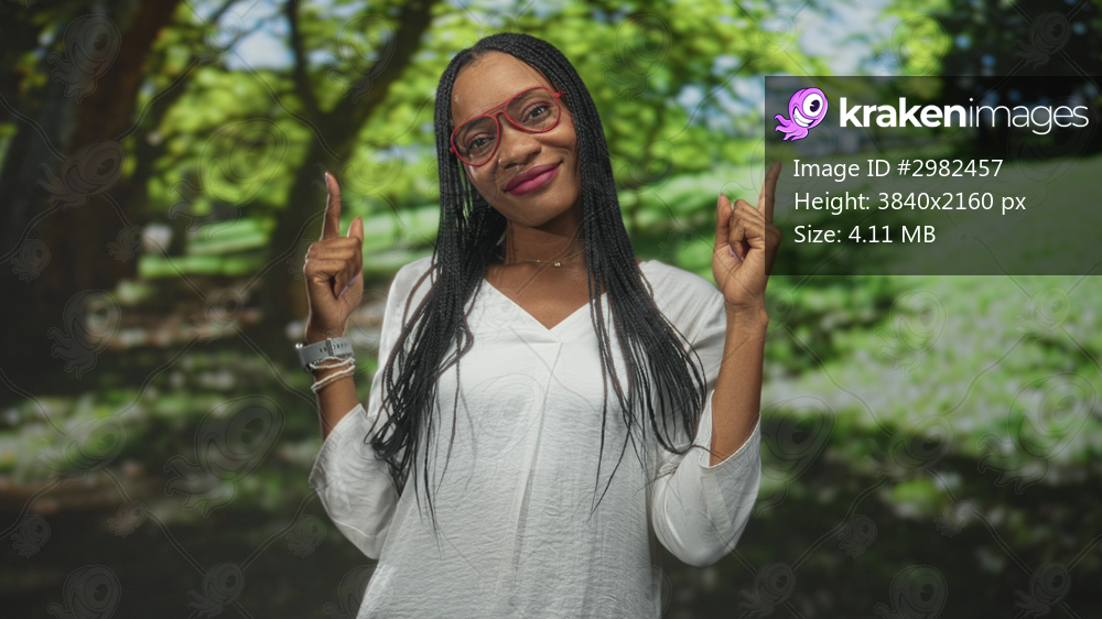 Black woman wearing red glasses points both index fingers upward with a friendly smile in a studio with forest backdrop; confidence.
