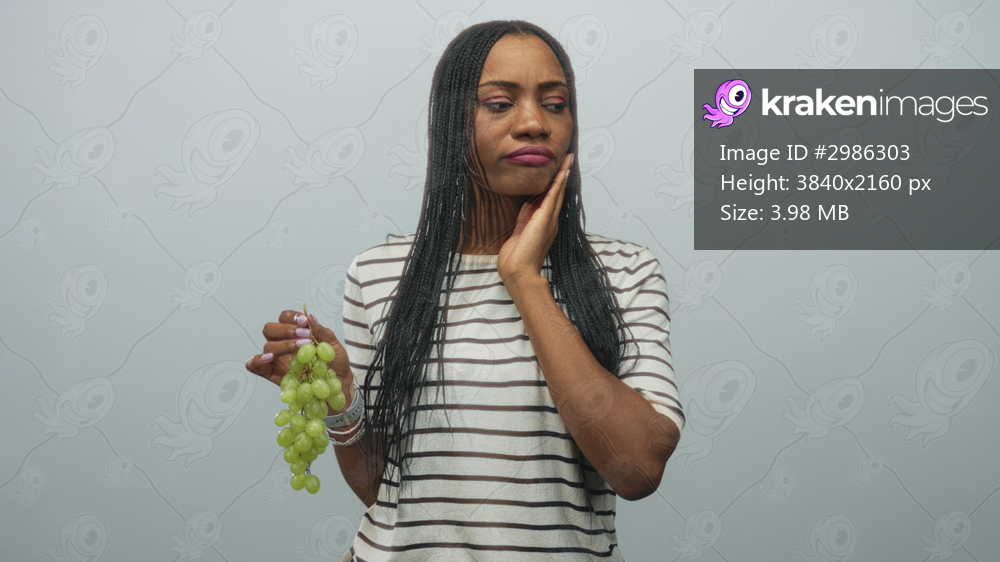 Black woman wearing striped shirt holding green grapes, touching cheek with hand for toothache in a studio; discomfort.