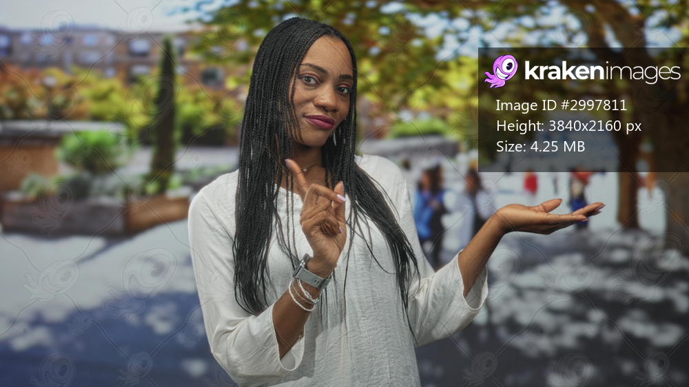 Black woman wearing white blouse and bracelets presenting palm up while pointing finger toward an urban street plaza with trees and blurred pedestrians; confidence. - Kraken Images