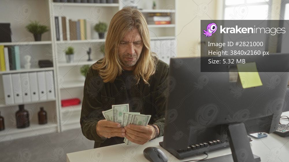 Blond businessman with long hair attentively counts cash at a white desk in office building; ambition.