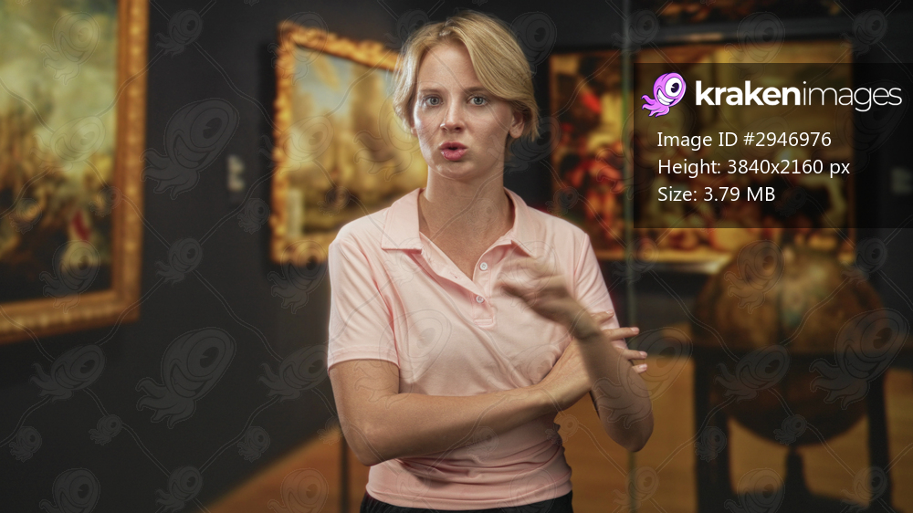 Blond caucasian woman with crossed arms gesturing at framed paintings and a globe exhibit in a museum wearing pink polo; art discussion confidence.