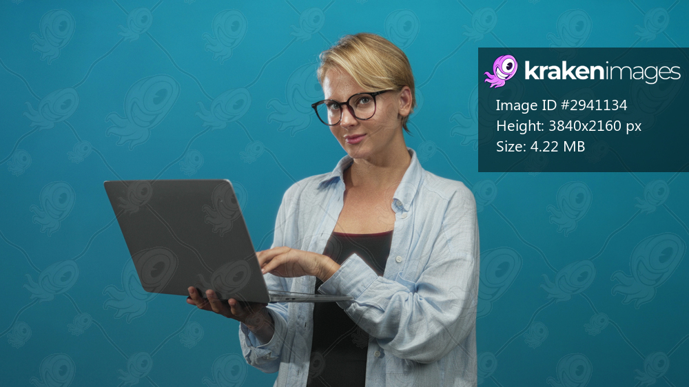 Blond caucasian woman typing on laptop in studio, holding the device with both hands and looking at the screen while wearing glasses and a light shirt; concentration. - Kraken Images