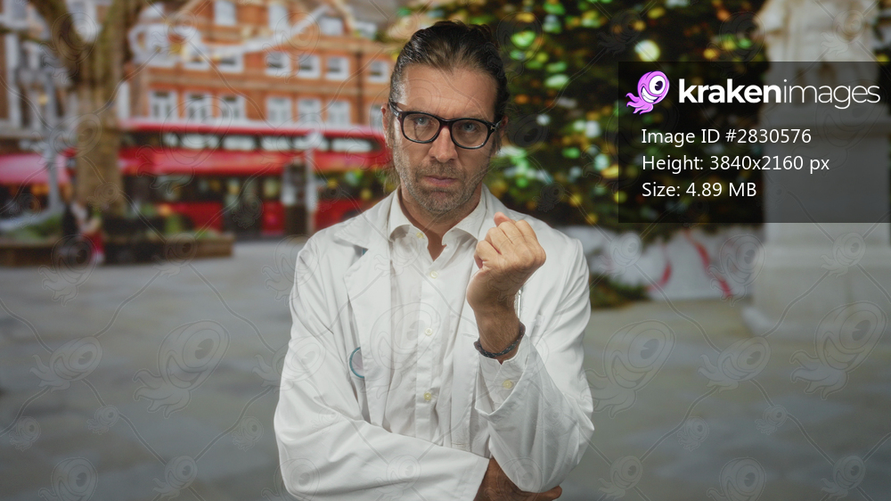 Blond man doctor with long hair and stethoscope beckons in front of building on urban street; invitation trust care empathy.