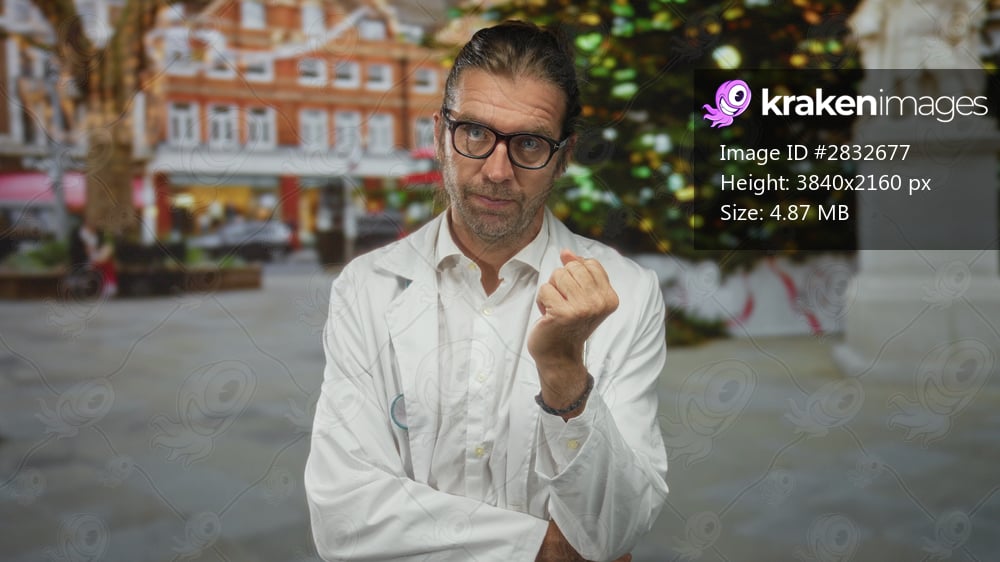 Blond man doctor with long hair and stethoscope beckons in front of building on urban street; invitation trust care empathy.