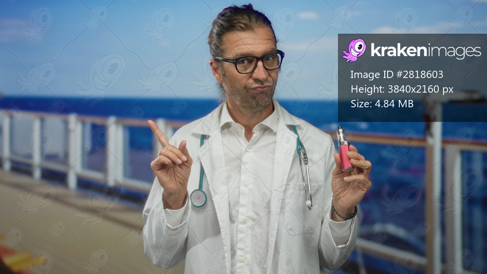 Blond man doctor with long hair and stethoscope pointing finger to vape on street deck; health warning.