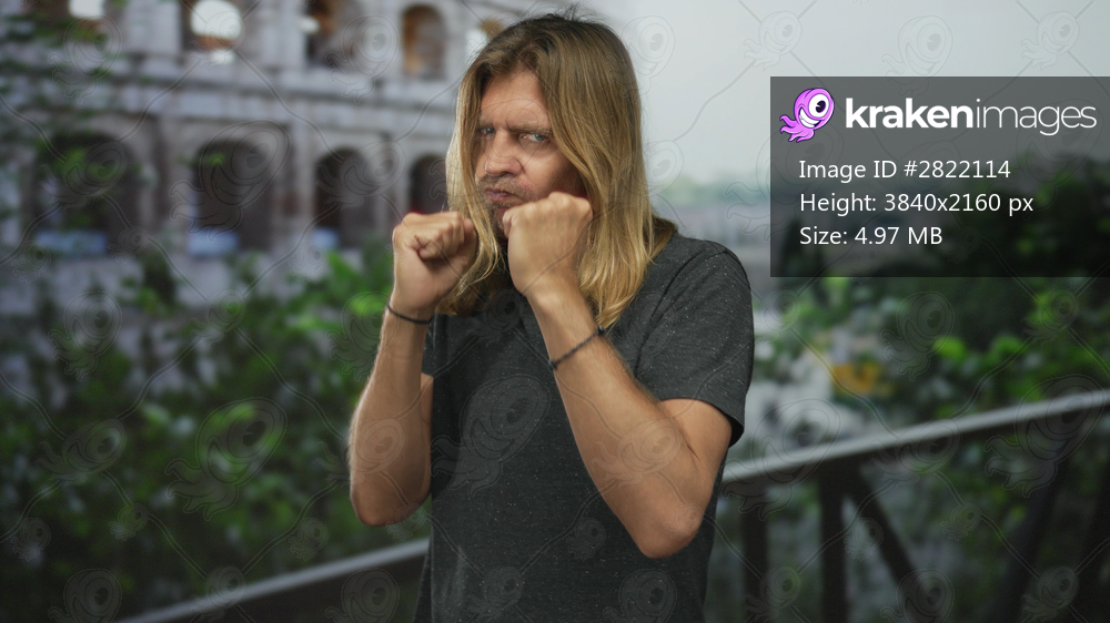 Blond man with fists raised in fighting stance at roman coliseum ruins balcony overlooking greenery; determination.