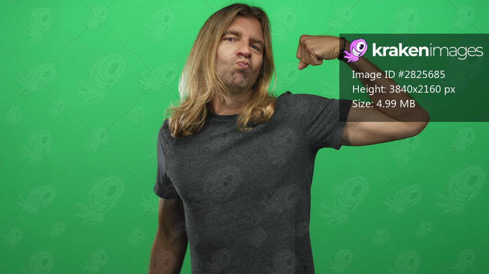 Blond man flexing bicep and clenching fist in vivid green studio set; confidence empowerment motivation energy.