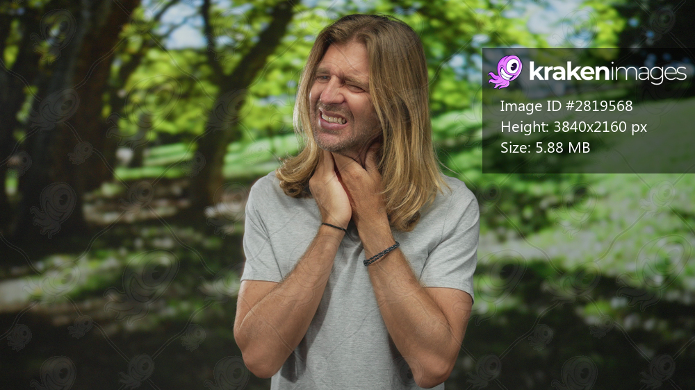 Blond man grasps neck while grimacing amid sunlight filtered canopy in forest clearing; discomfort tension strain stress.