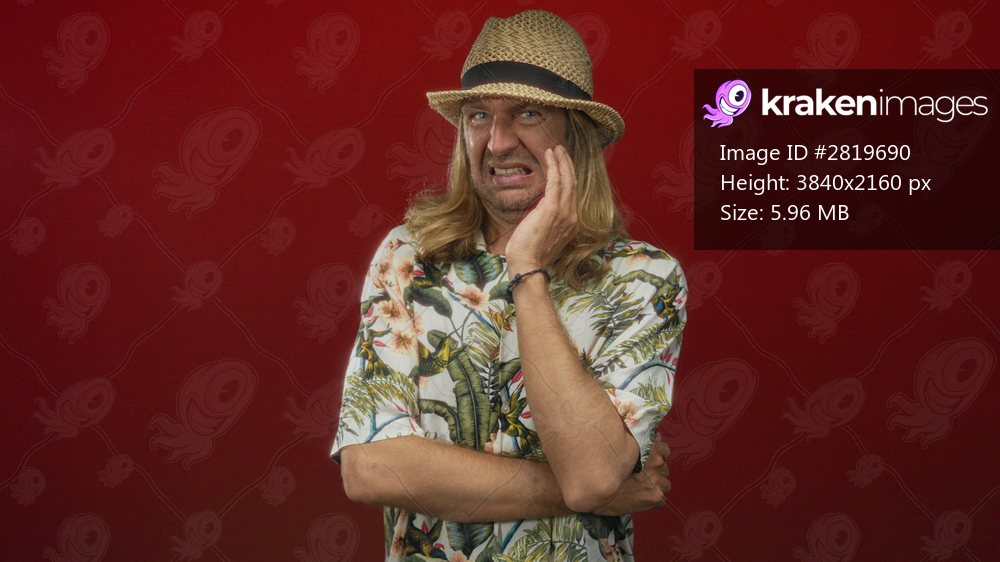 Blond man grimaces and holds hand on cheek for toothache in studio; distress pain discomfort unease.