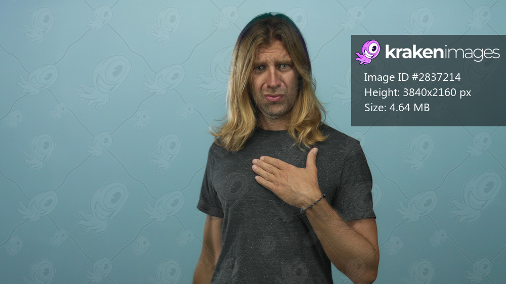 Blond man with hand on chest in studio setting showing focused gaze and subtle posture conveys a personal moment; surprise.