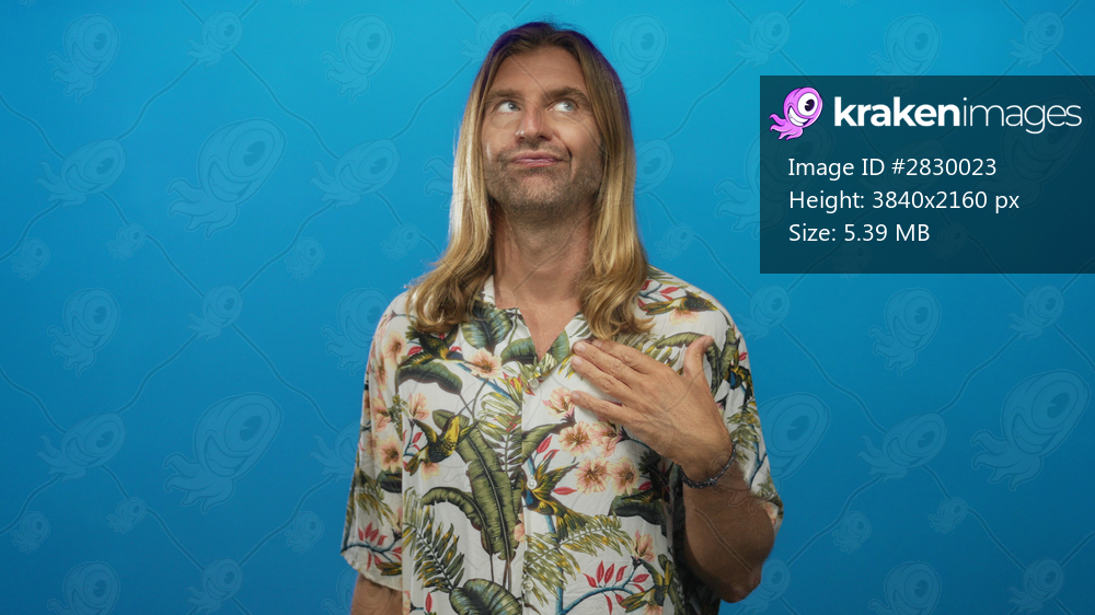 Blond man with hand on chest wearing a tropical floral shirt and long hair falling over shoulders in studio; surprise.